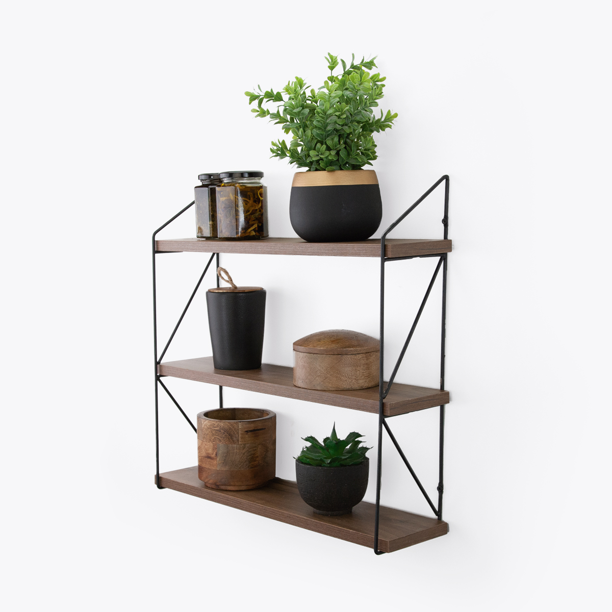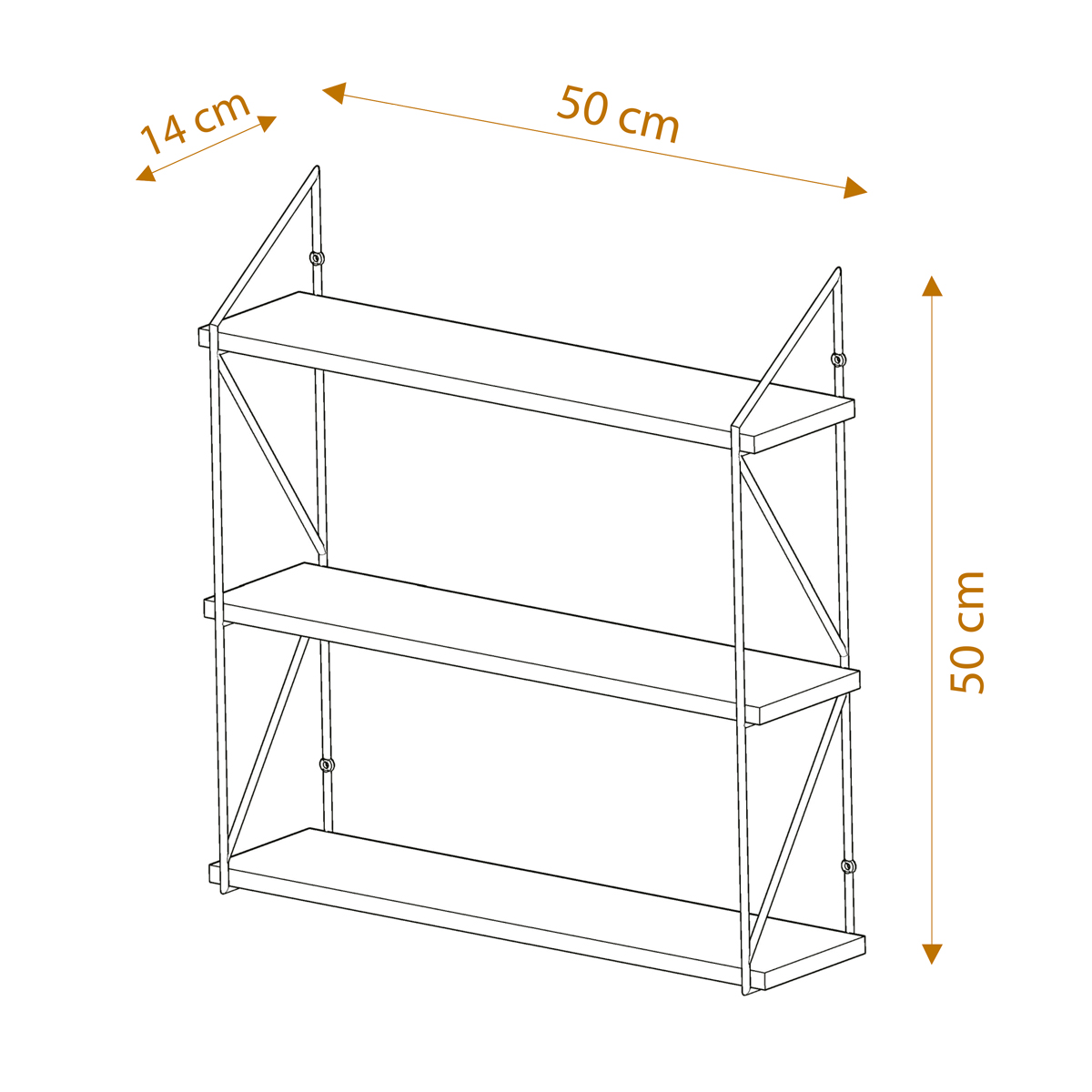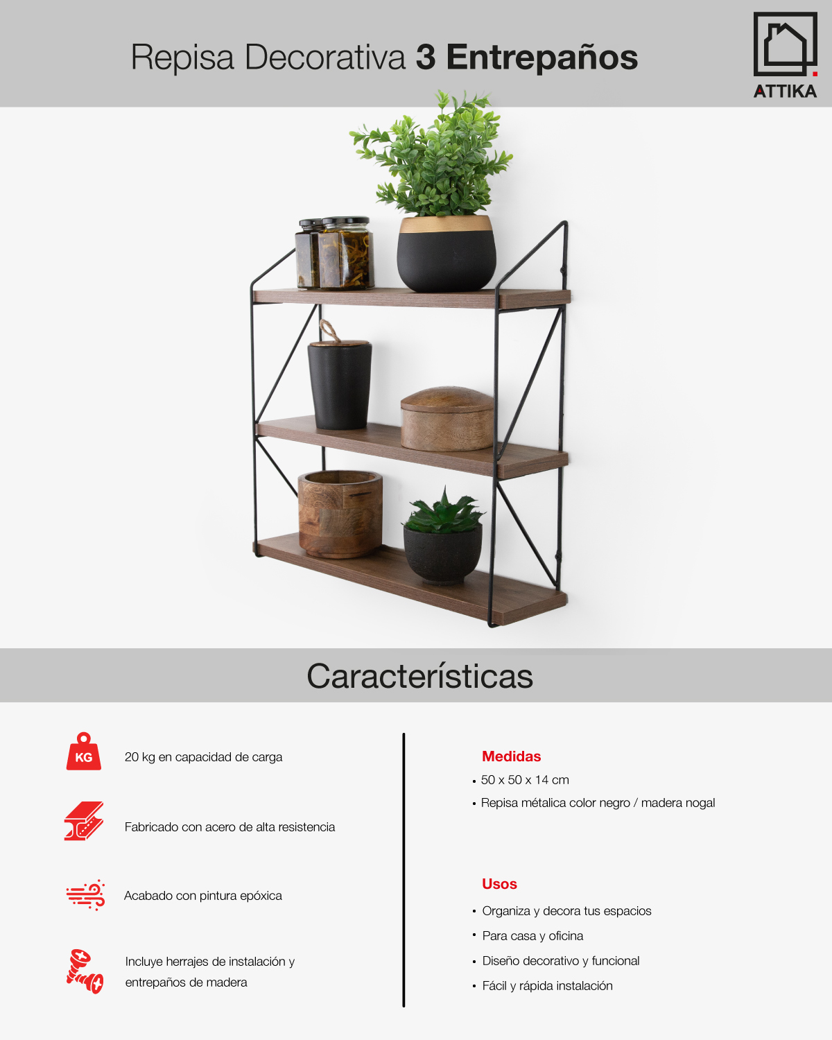 Diseño decorativo y funcional. Repisa con 3 entrepaños que da un toque decorativo a cualquier espacio del hogar y oficina. Correctamente instalado carga hasta 20 kg de peso uniformemente repartido. Fabricado en acero. Durable y resistente acabado en pintura en polvo horneada que evita la corrosión y protege contra golpes y rayaduras. Incluye dos entrepaños de madera melamínica color nogal. Incluye instructivo de armado y herrajes para su correcta instalación. Medidas: 50 cm (alto) x 50 cm (ancho) x 14 cm (profundidad). Orgullosamente hecho en México.