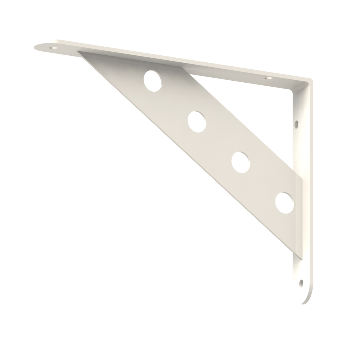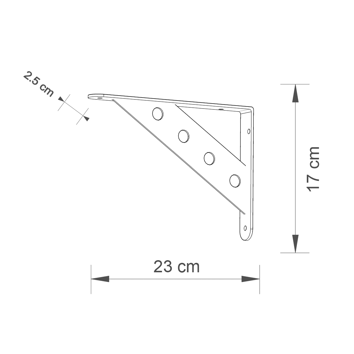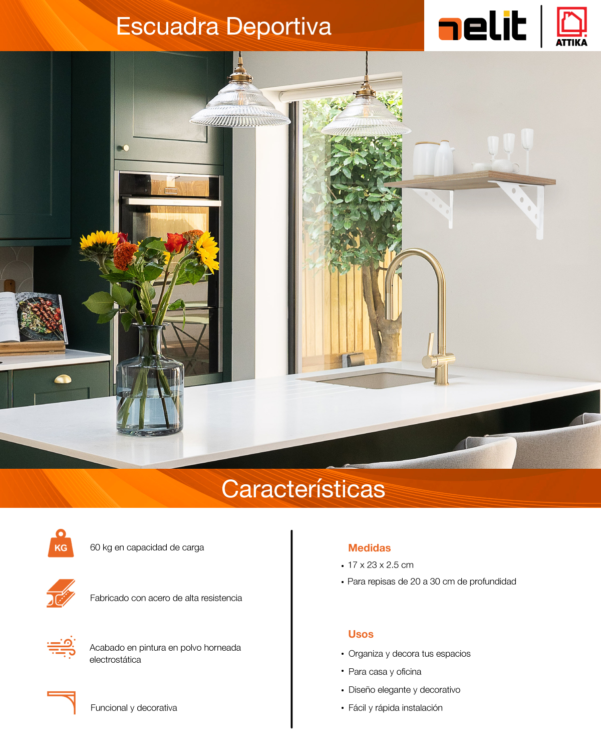Diseño elegante y decorativo. Escuadra fácil de instalar para repisas de 20 a 30 cm de profundidad. Correctamente instalado carga hasta 60 kg repartidos por par. Fabricado en acero. Durable y resistente acabado en pintura en polvo horneada que evita la corrosión y protege contra golpes y rayaduras. Se recomienda instalar una escuadra cada 90 cm lineales. Orgullosamente hecho en México.