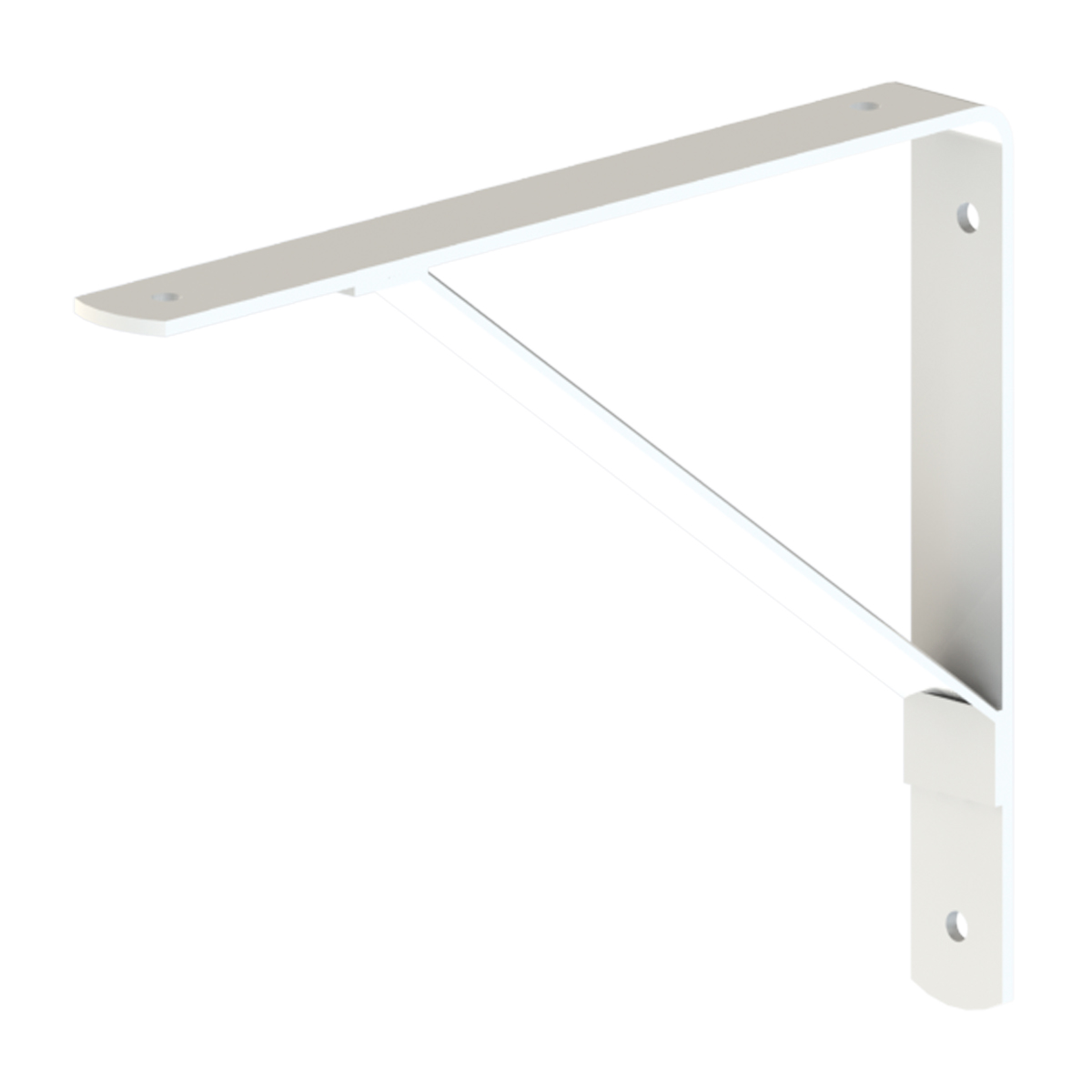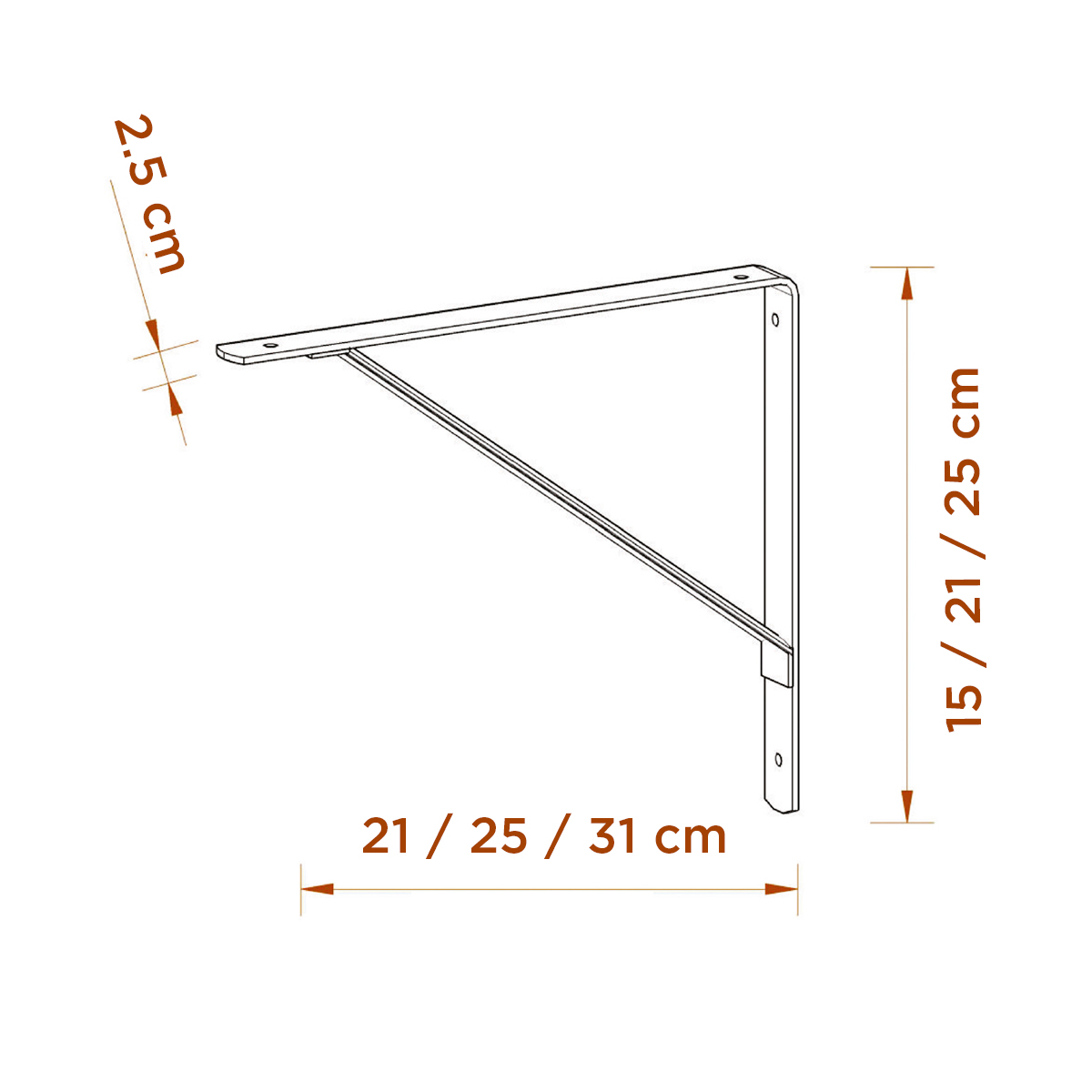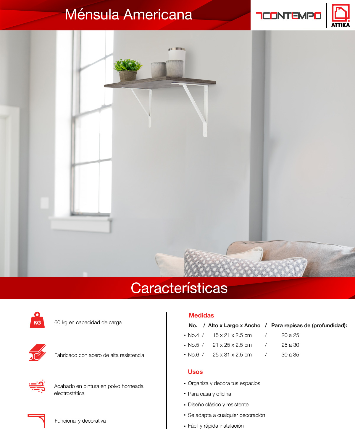 Diseño clásico y resistente que se adapta a cualquier decoración. Ménsula fácil de instalar para repisas de 20 a 25 cm de profundidad. Correctamente instalado carga hasta 60 kg repartidos por par. Fabricado en acero. Durable y resistente acabado en pintura en polvo horneada que evita la corrosión y protege contra golpes y rayaduras. Se recomienda instalar una ménsula cada 90 cm lineales. Orgullosamente hecho en México.