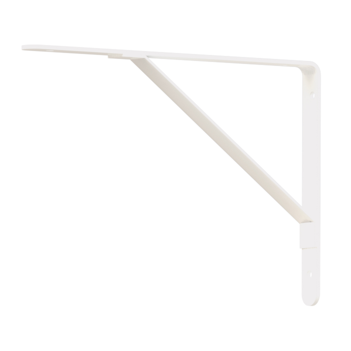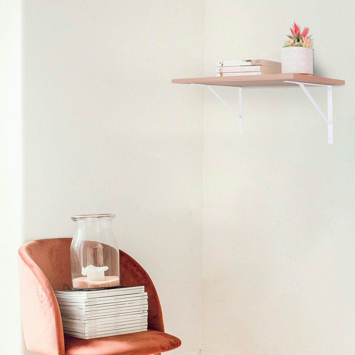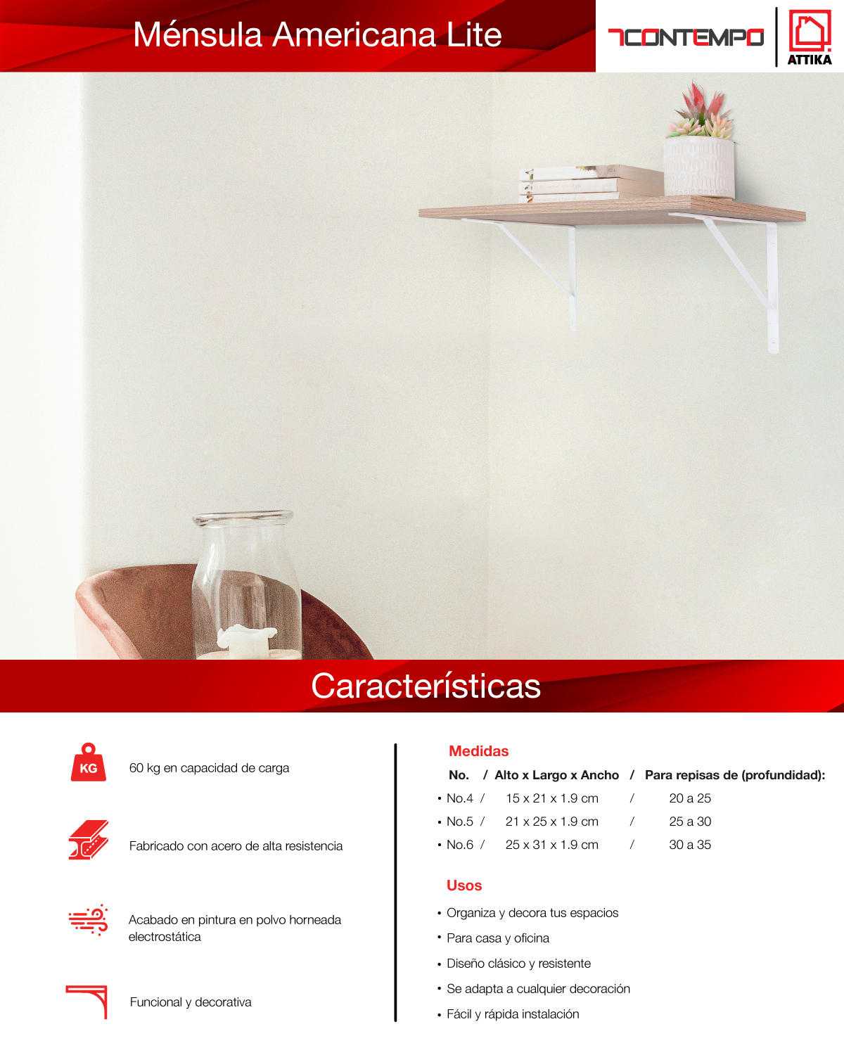 Diseño clásico y resistente que se adapta a cualquier decoración. Ménsula fácil de instalar para repisas de 15 a 20 cm de profundidad. Correctamente instalado carga hasta 60 kg repartidos por par. Fabricado en acero. Durable y resistente acabado en pintura en polvo horneada que evita la corrosión y protege contra golpes y rayaduras. Se recomienda instalar una ménsula cada 90 cm lineales. Orgullosamente hecho en México.