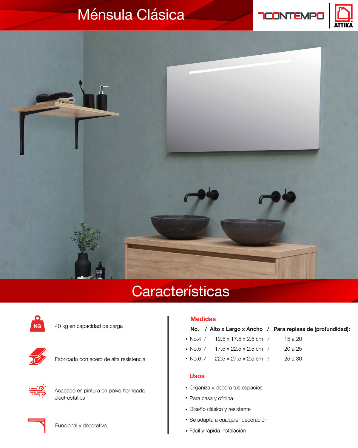 Diseño clásico y funcional que se adapta a cualquier decoración. Ménsula fácil de instalar para repisas de 20 a 25 cm de profundidad. Correctamente instalado carga hasta 30 kg repartidos por par. Fabricado en acero. Durable y resistente acabado en pintura en polvo horneada que evita la corrosión y protege contra golpes y rayaduras. Se recomienda instalar una ménsula cada 90 cm lineales. Orgullosamente hecho en México.
