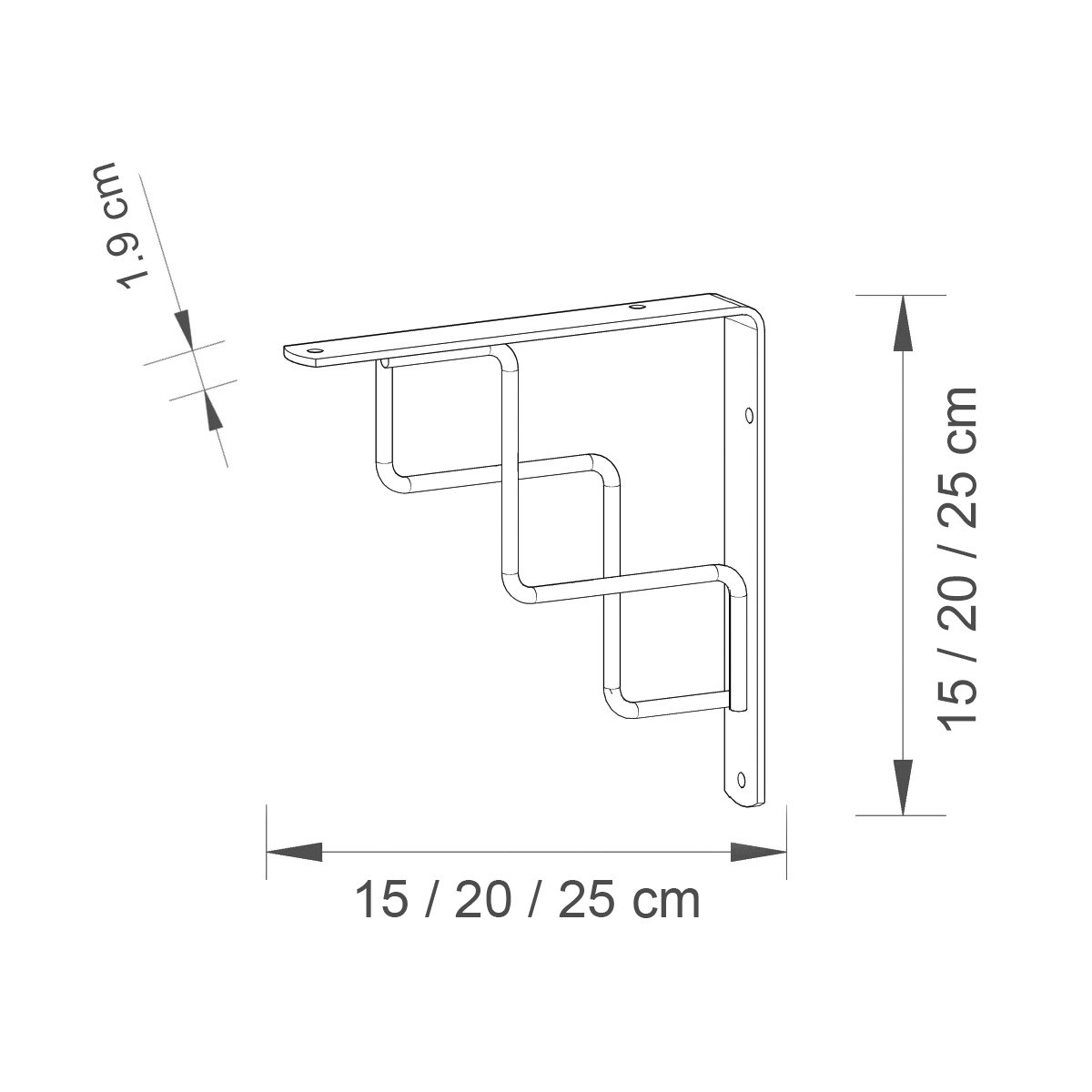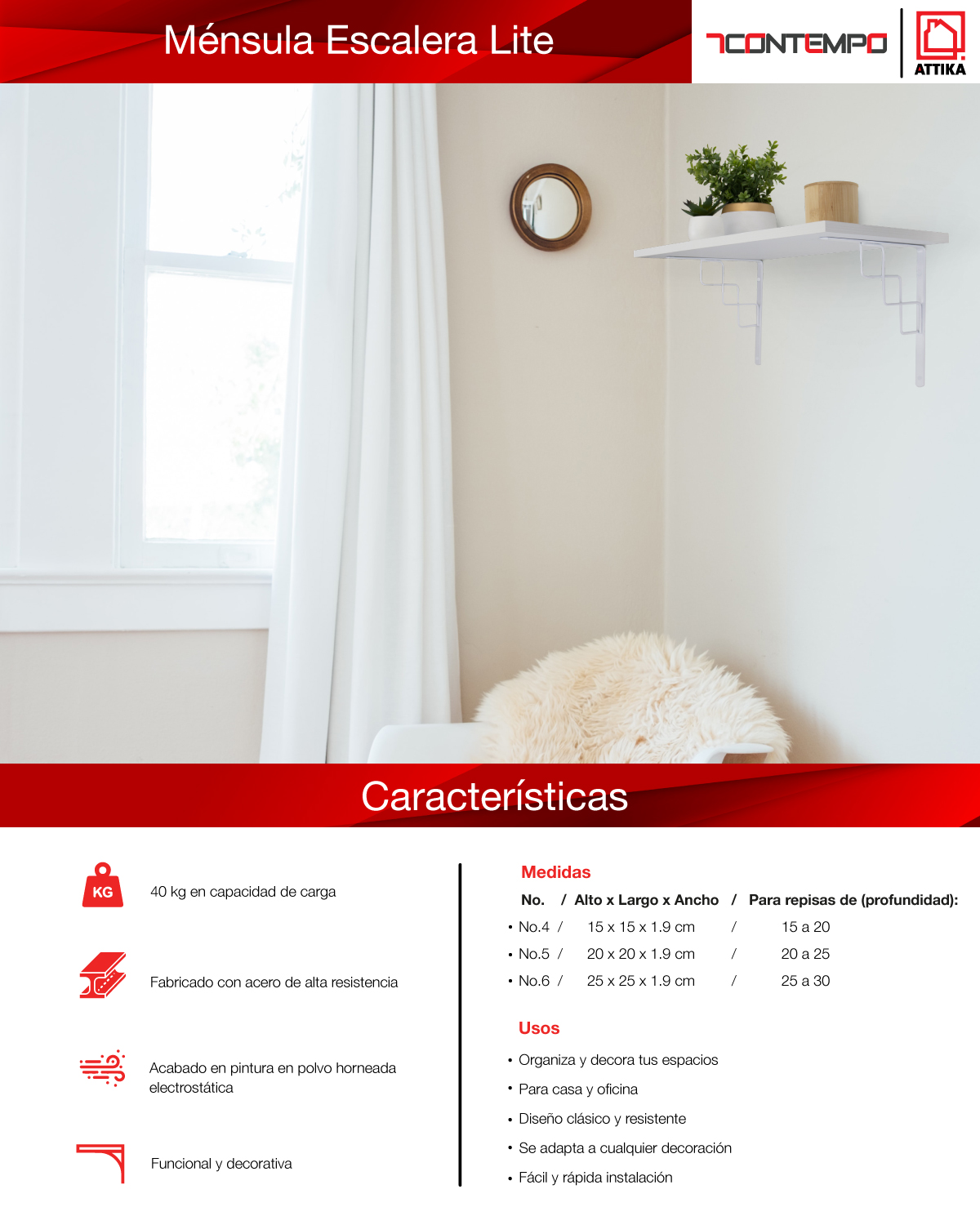 Diseño clásico y resistente que se adapta a cualquier decoración. Ménsula fácil de instalar para repisas de 15 a 20 cm de profundidad. Correctamente instalado carga hasta 60 kg repartidos por par. Fabricado en acero. Durable y resistente acabado en pintura en polvo horneada que evita la corrosión y protege contra golpes y rayaduras. Se recomienda instalar una ménsula cada 90 cm lineales. Orgullosamente hecho en México.