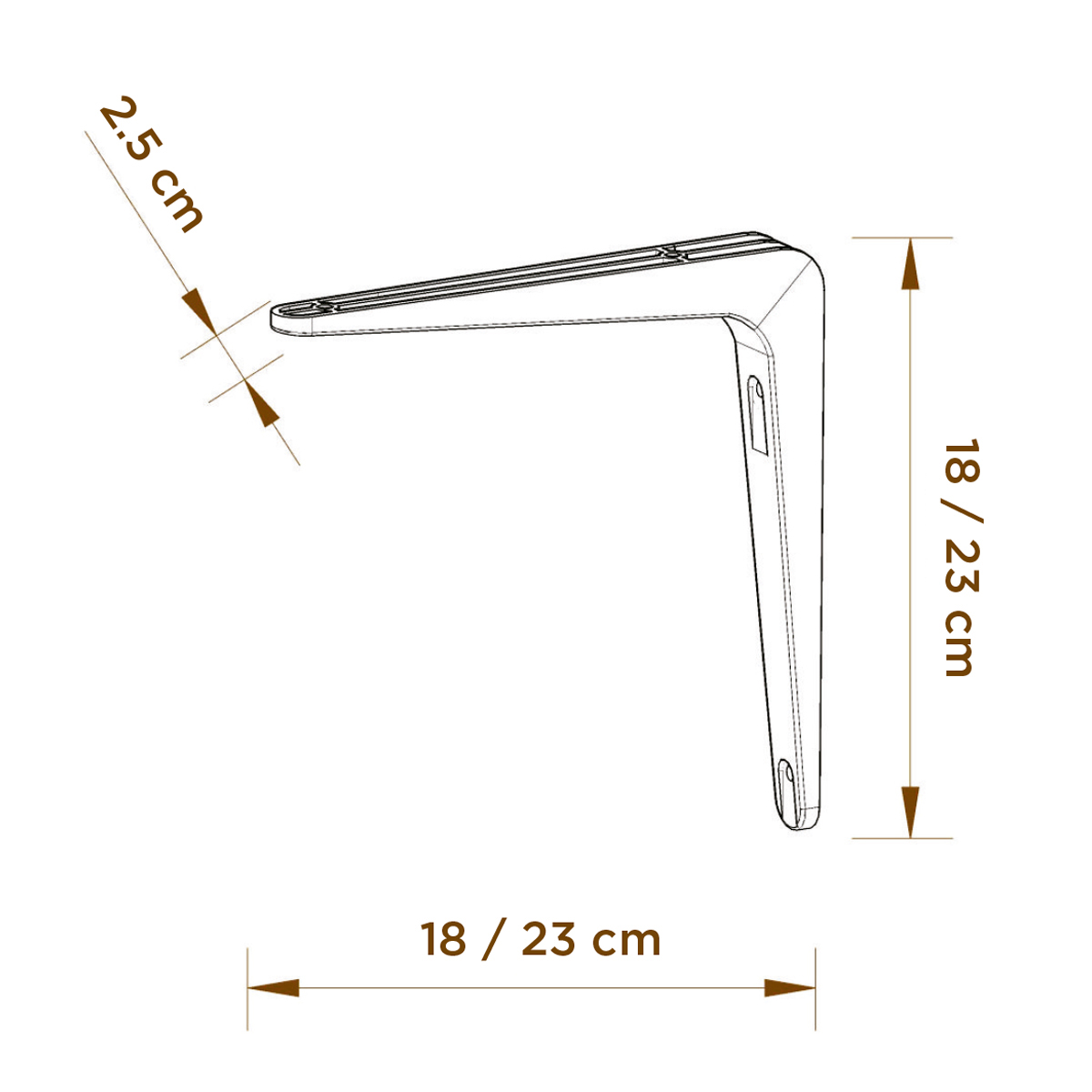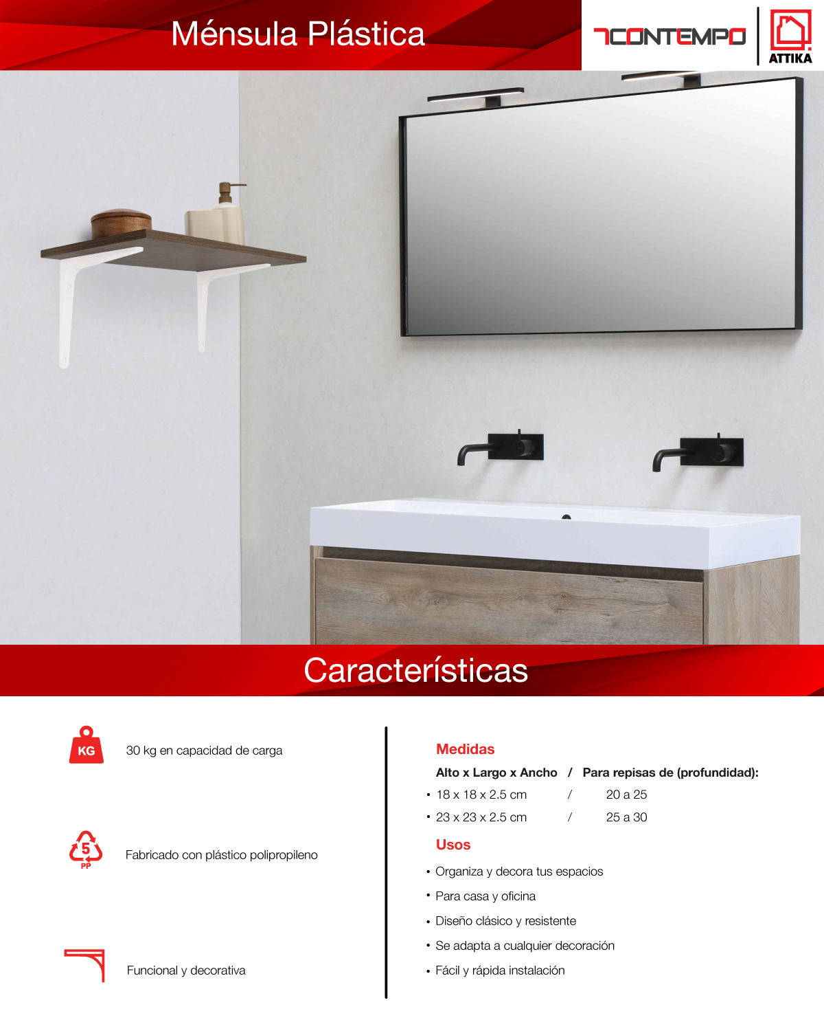 Diseño simple y funcional. Escuadra fácil de instalar para repisas de 20 a 25 cm de profundidad. Correctamente instalado carga hasta 30 kg repartidos por par. Fabricados en plástico polipropileno extra resistente. Se recomienda instalar una escuadra cada 90 cm lineales. Orgullosamente hecho en México.