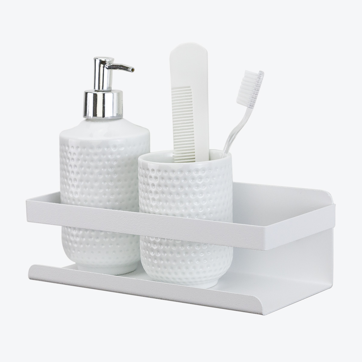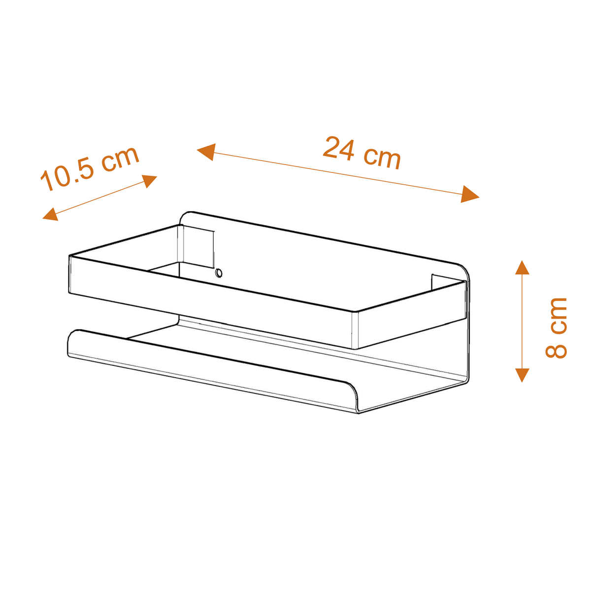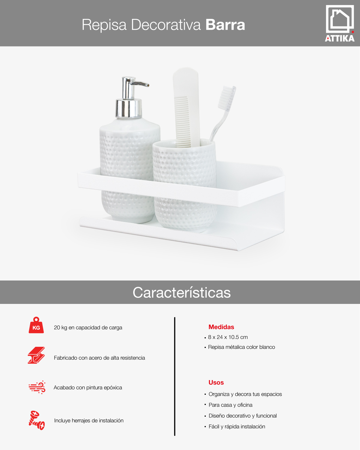 Diseño decorativo y funcional. Repisa barra para organización de artículos de baño, cocina y hogar en general. Correctamente instalado carga hasta 20 kg de peso repartido. Fabricado en acero. Durable y resistente acabado en pintura en polvo horneada que evita la corrosión y protege contra golpes y rayaduras. Incluye herrajes de instalación. Medidas: 8 cm (alto) x 24 cm (ancho) x 10.5 cm (profundidad). Orgullosamente hecho en México.