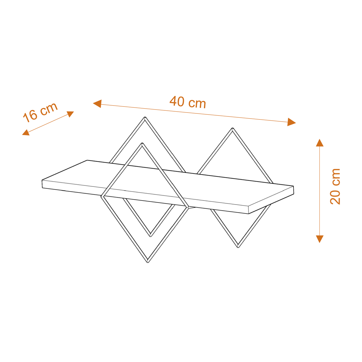 Diseño decorativo y funcional. Repisa prisma decorativa con atractivo diseño contemporáneo. Correctamente instalado carga hasta 40 kg de peso uniformemente repartido. Fabricado en acero. Durable y resistente acabado en pintura en polvo horneada que evita la corrosión y protege contra golpes y rayaduras. Incluye repisa de madera melamínica color fresno. Incluye herrajes de instalación. Medidas: 20 cm (alto) x 60 cm (ancho) x 18 cm (profundidad). Orgullosamente hecho en México.
