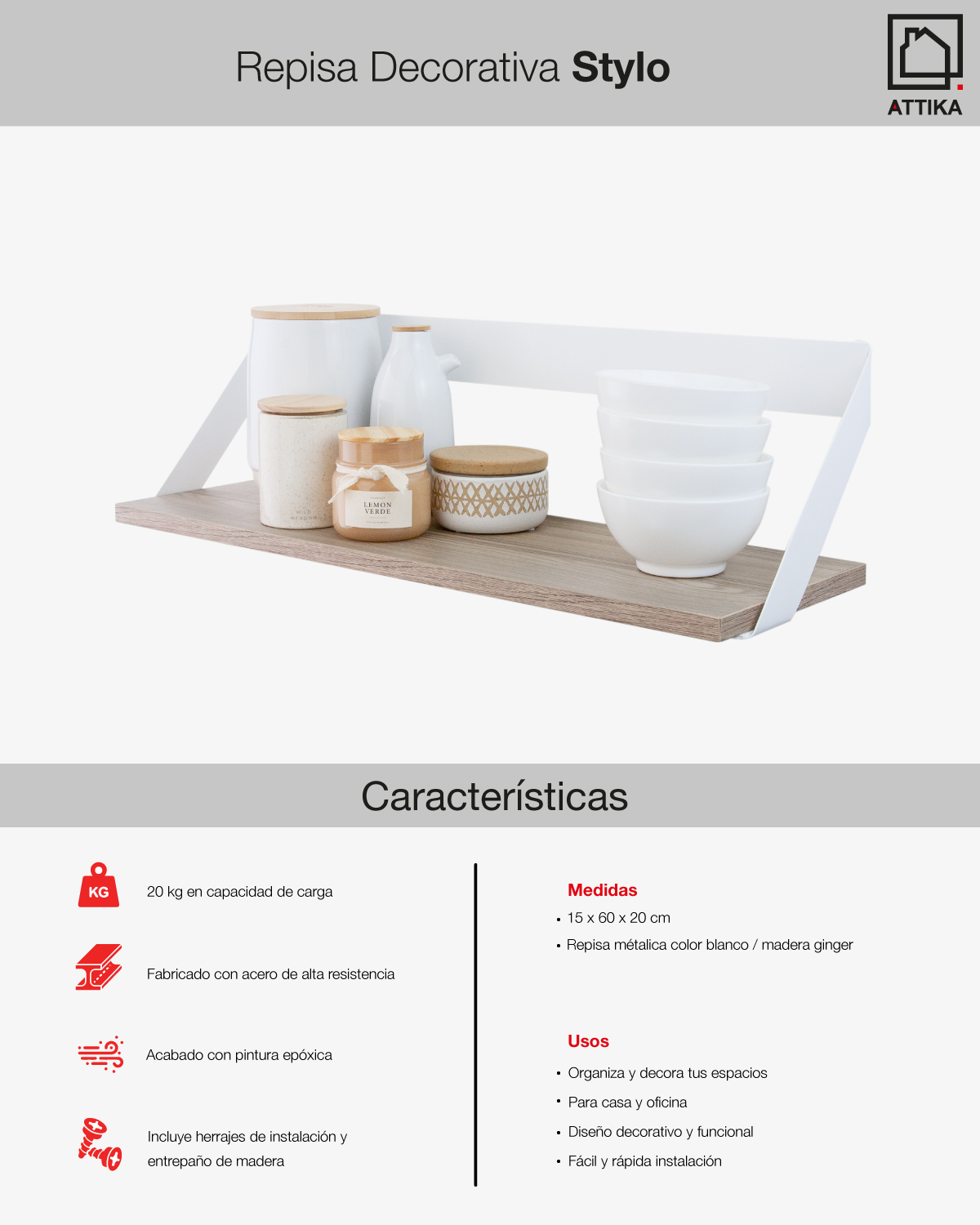 Diseño decorativo y funcional. Repisa Stylo para objetos decorativos y organización en general. Correctamente instalado carga hasta 20 kg de peso repartido. Fabricado en acero. Durable y resistente acabado en pintura en polvo horneada que evita la corrosión y protege contra golpes y rayaduras. Incluye herrajes de instalación. Medidas: 15 cm (alto) x 60 cm (ancho) x 20 cm (profundidad). Orgullosamente hecho en México.