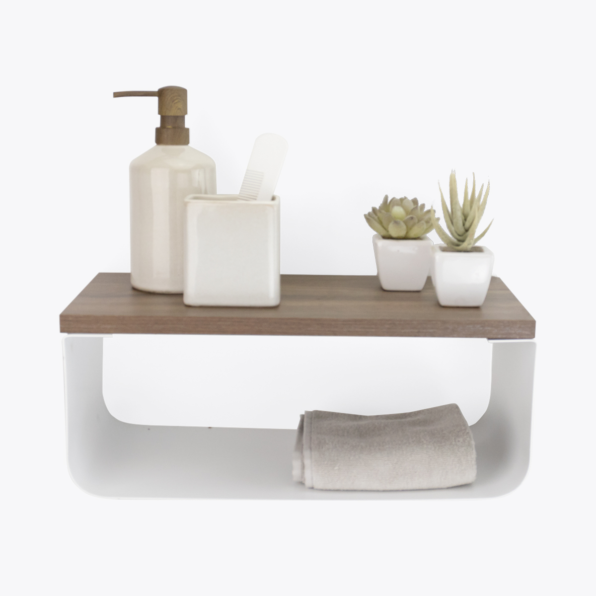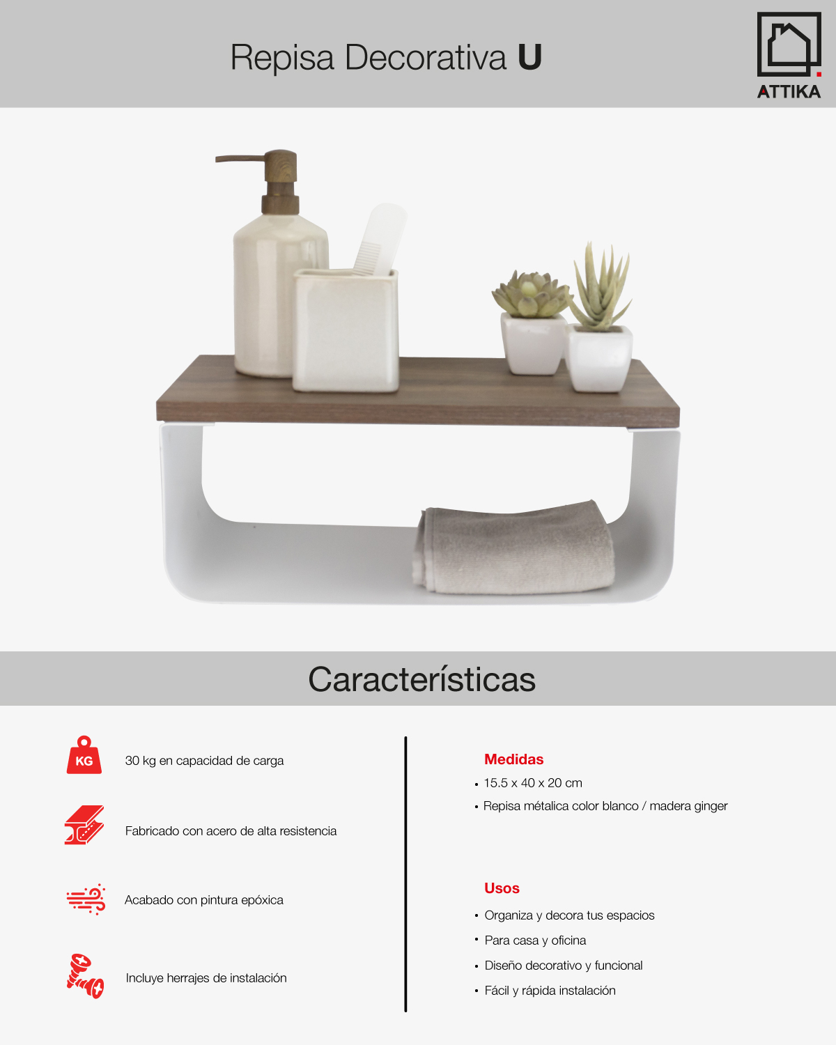 Diseño decorativo y funcional. Repisa U para objetos decorativos y organización en general. Correctamente instalado carga hasta 30 kg de peso repartido. Fabricado en acero. Durable y resistente acabado en pintura en polvo horneada que evita la corrosión y protege contra golpes y rayaduras. Incluye herrajes de instalación. Medidas: 15.5 cm (alto) x 40 cm (ancho) x 20 cm (profundidad). Orgullosamente hecho en México.