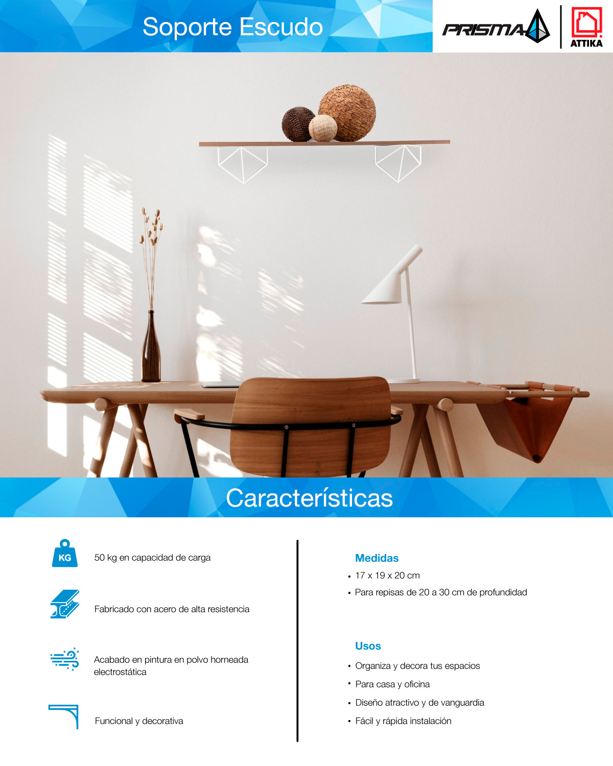 Diseño atractivo y de vanguardia. Soporte fácil de instalar para repisas de 20 a 30 cm de profundidad. Correctamente instalado carga hasta 50 kg repartidos por par. Fabricado en acero. Durable y resistente acabado en pintura en polvo horneada que evita la corrosión y protege contra golpes y rayaduras. Se recomienda instalar un soporte cada 90 cm lineales. Orgullosamente hecho en México.