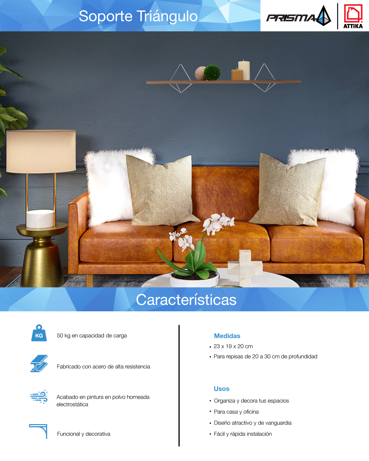 Diseño atractivo y de vanguardia. Soporte fácil de instalar para repisas de 20 a 30 cm de profundidad. Correctamente instalado carga hasta 50 kg repartidos por par. Fabricado en acero. Durable y resistente acabado en pintura en polvo horneada que evita la corrosión y protege contra golpes y rayaduras. Se recomienda instalar un soporte cada 90 cm lineales. Orgullosamente hecho en México.